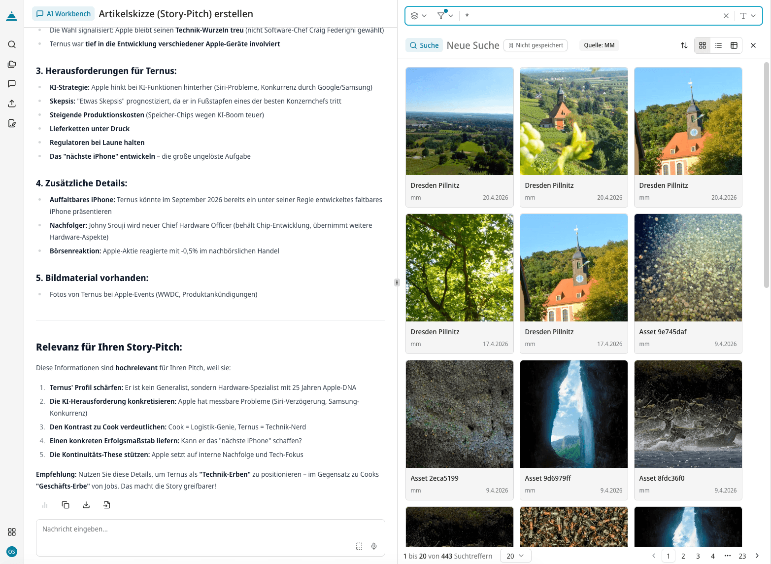 Keine Chatbot-Spielerei, sondern agentenbasierte Assistenz: Recherche-Agent, Fact Checker, Audience Expert — spezialisierte KI-Agenten, die kontextbezogen und proaktiv arbeiten. Mit der Prompt-Bibliothek konfigurierbar, über den Content Backbone immer am Puls eurer Daten.